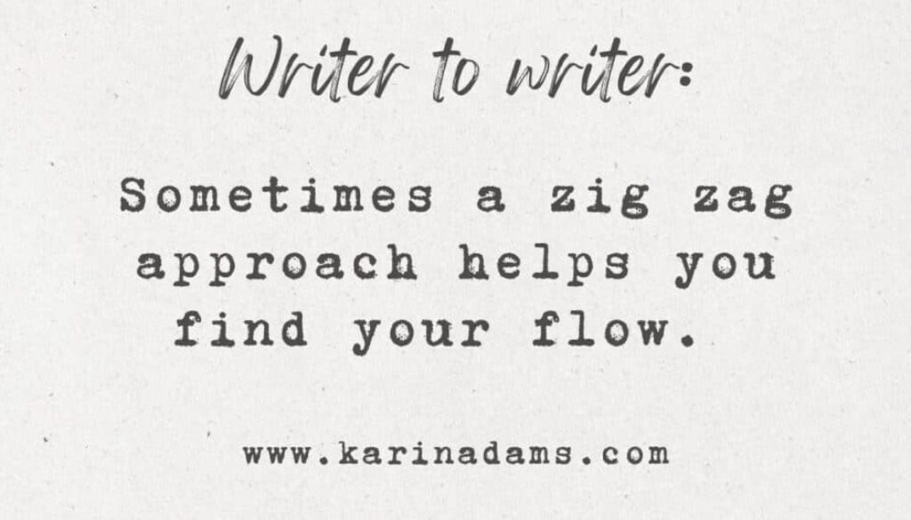 The above may be obvious, but I’ve seen many writers whose creative blocks are rooted in not realizing that they can zig zag and jump around. They stay stuck because they think flowing is the only way – and when things aren’t flowing, they’ve somehow fallen short. Meanwhile stepping out of flow and zig zagging is a powerful tool that keeps us going. I’m here to tell you not to forget that this is an option!